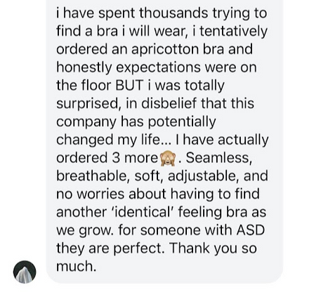 They have no itchy tags, seams or underwires for the most comfy everyday bra. Hundreds of neurodivergent individuals have struggled to find comfy bras before trying Apricotton bras 💛